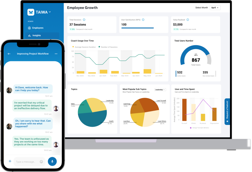 HR leaders often lack a personalized, confidential resource for guidance. TAIWA® fills this gap with an AI-powered coaching platform tailored to each HR leader. By integrating organizational insights and employee feedback, TAIWA® offers confidential coaching that enhances leadership and coaching skills within your organization.